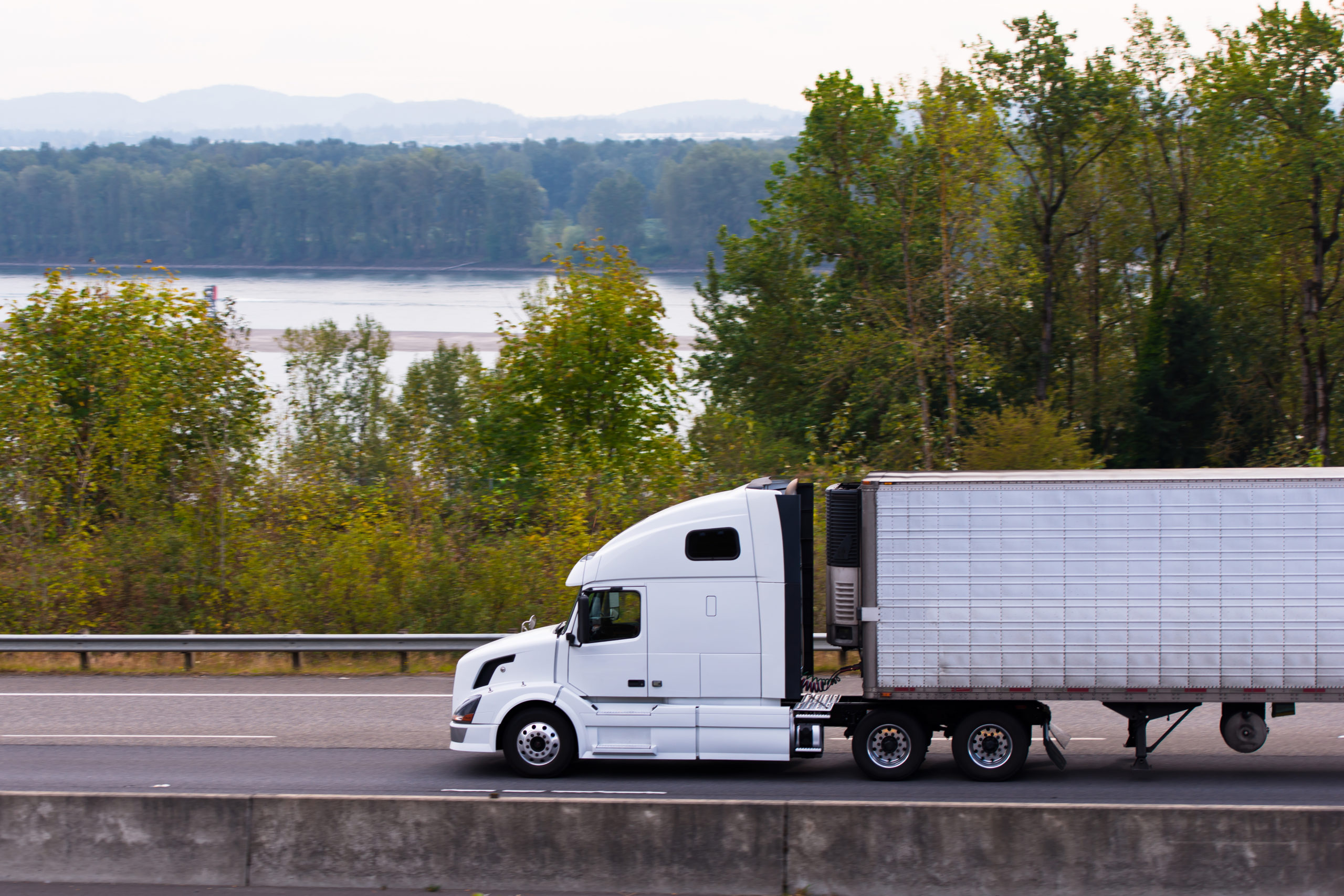 White modern semi truck reefer on highway along river Columbia